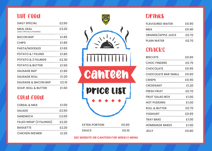 Please note: some canteen prices have increased but the cost of a daily special (main meal) and meal deal (main and dessert) remains the same.