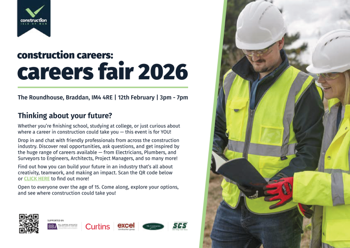 Construction IOM have arranged a Careers Fair for anyone aged 15+ who is interested in a career in the construction industry. The event will take place on Thursday 12 February 2026 at the Roundhouse in Braddan, from 3.00pm to 7.00pm.